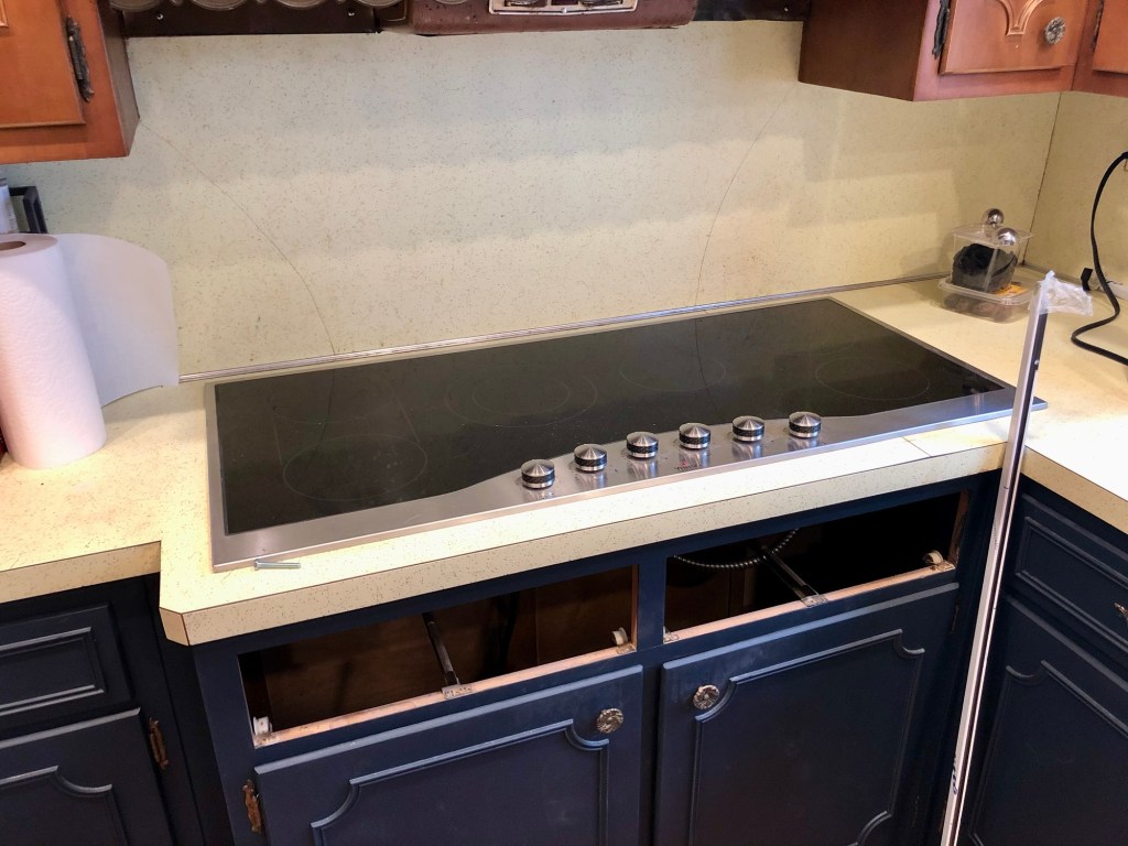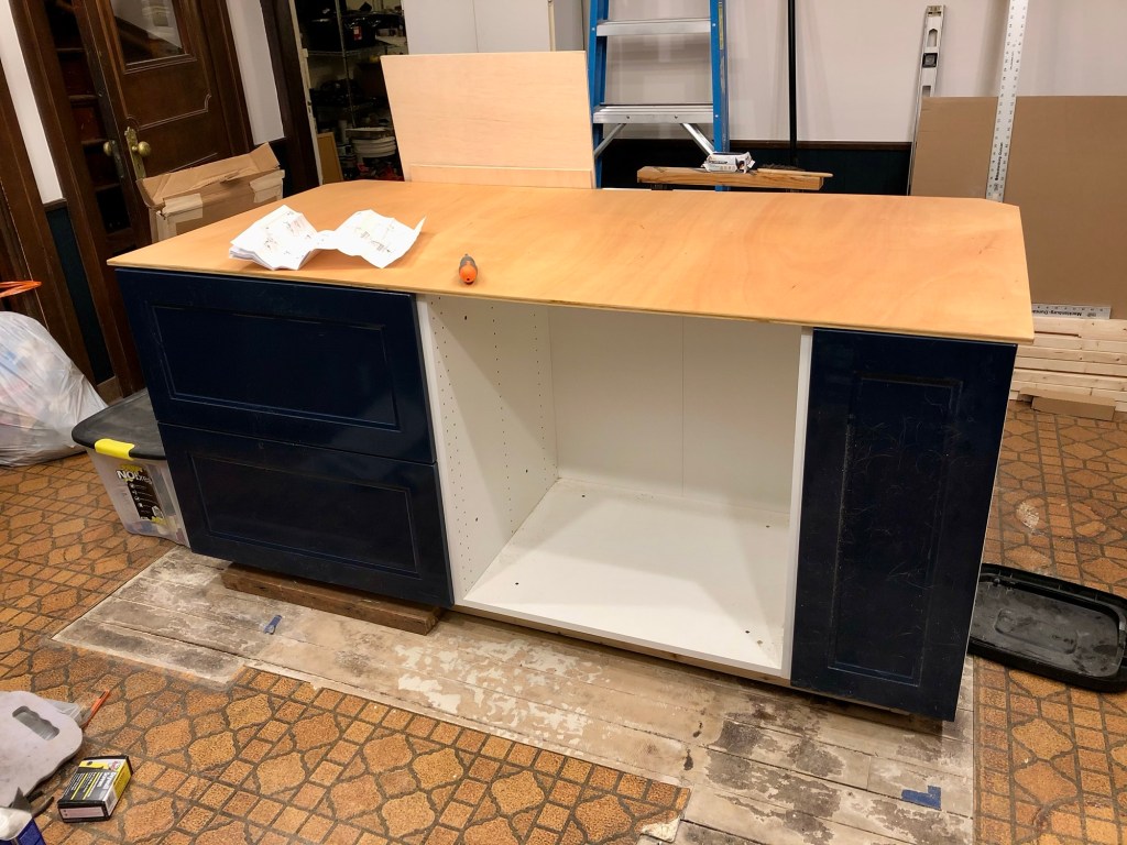 We ended up going to one straight cabinet run and for the purpose of getting it “functional” ahead of our wedding, we put a plywood top on until we had the chance to replace it with a butcherblock top which we did in March 2022.