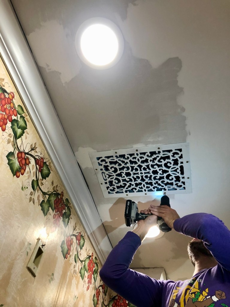 We know the Kitchen ceiling is dropped because the previous owner had a failed radiator leak and the ceiling was opened for repairs. The real estate agent told the seller to leave it open to show that the height could go up about a foot or two- which we do eventually plan to do, but for now? It’s time to close up the hazard. The original ceiling was crumbling down and came down over our poor unsuspecting pup and we did not want this happening again of course. And so, we learned how to drywall… While we were doing do, we realized the water pipes that run above were uninsulated and at risk for possible freeze-up if we were to completely close up the ceiling so we looked for a decorative vent to allow for warm air exchange during the winter. We landed on a relatively heavy floor register, but we reinforced the drop ceiling framing and we think this has been pretty successful so far.