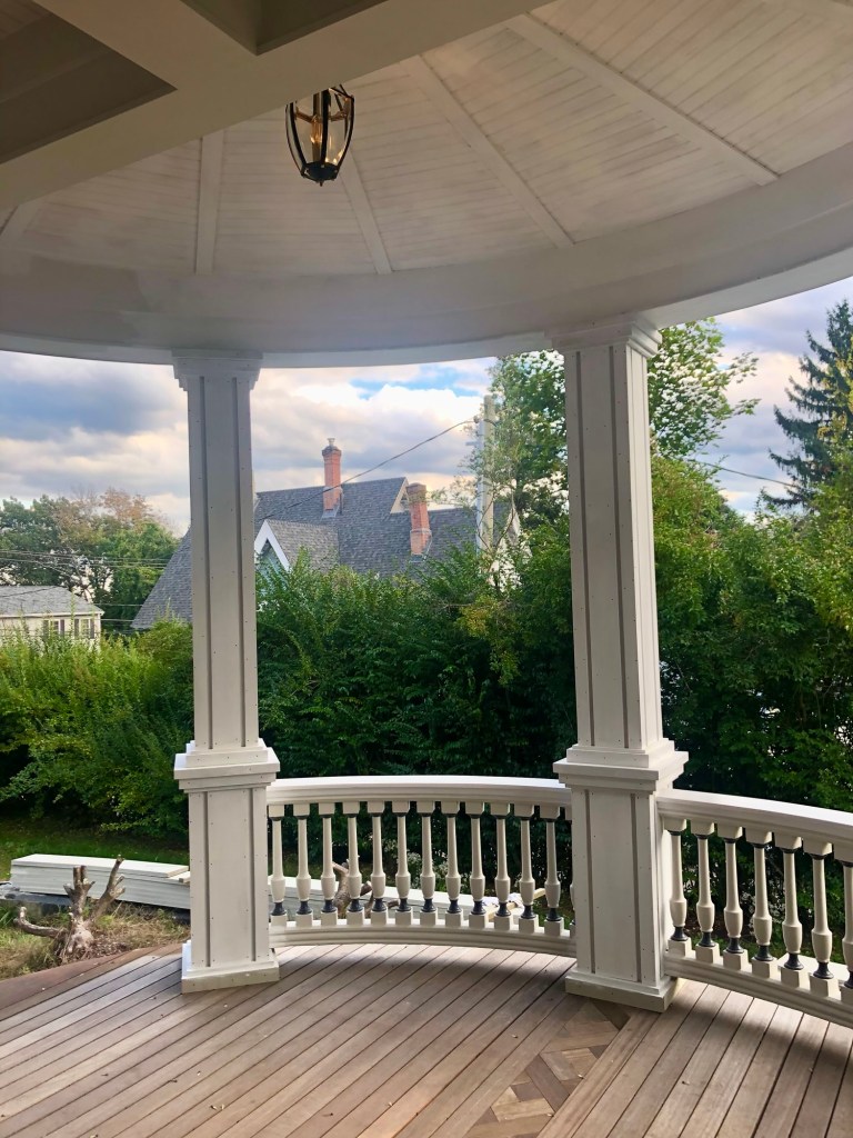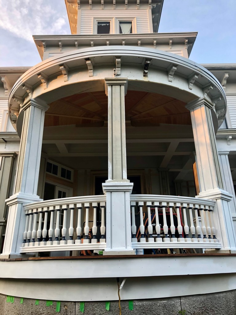 Our crew put the stained glass windows back in place and out our windows back in- tacked in place, not properly rehung yet. He also finished prepping our main lower railing and installed it between columns. The porch really started to look like it was close finally.